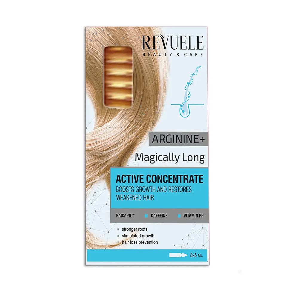 Концентрат Revuele для активації росту волосся в ампулах Аргенін+Магічна довжина збагачений активними інгредієнтами, які живлять суху та пошкоджену шкіру голови та коріння. Сприяє росту, запобігають випаданню волосся і надають волоссю густоти..