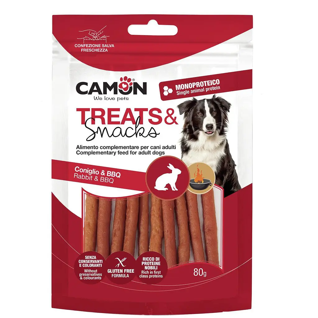 Смачні ласощі для дорослих собак на основі копченого кролика. Формула без глютену. Без барвників та консервантів. Багатий благородними білками. Склад: кролик 78,5%, гліцерин, кукурудзяний крохмаль, сорбітол, сіль.