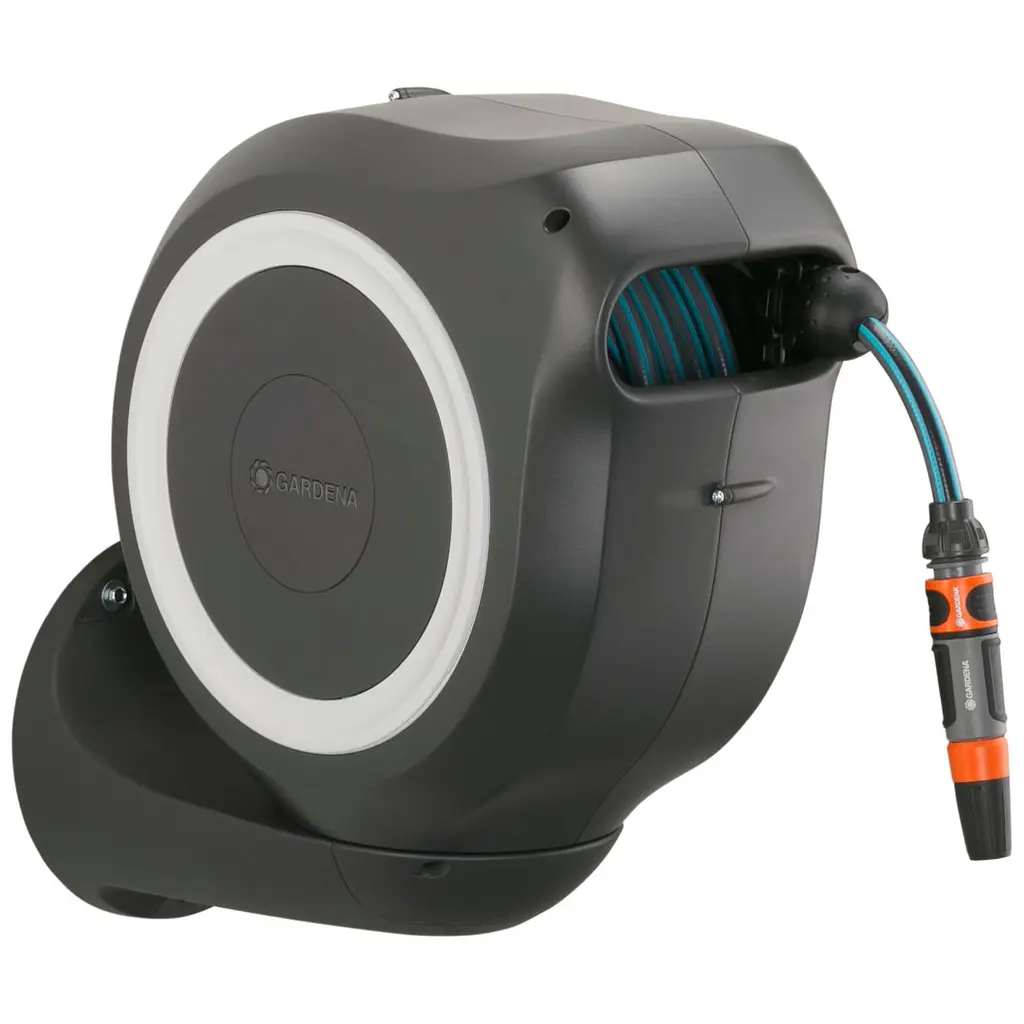 Котушка настінна Gardena RollUp M + набір для поливу 20 м - являє собою шланг 20 м з конекторами та наконечником для поливу, поміщений у спеціальну котушку (коробку) із настінним кріпленням та функцією автоматичного змотування шланга.