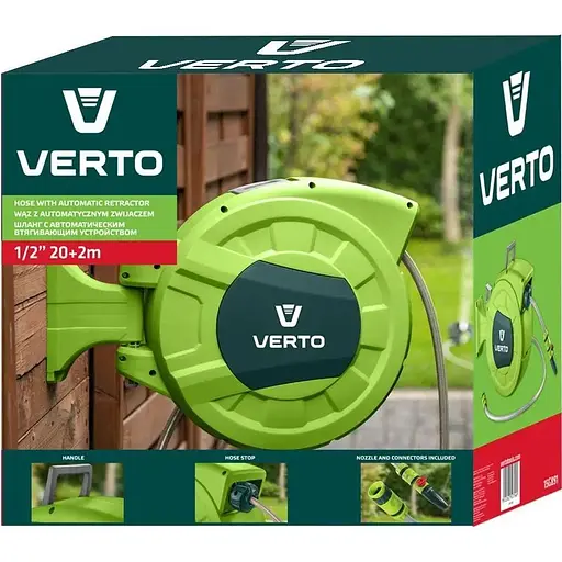 Котушка зі шлангом Verto автоматична - комплексний набір для поливу саду або ділянки. Він дозволяє економити простір, зберігаючи шланг у хорошому стані протягом багатьох сезонів.