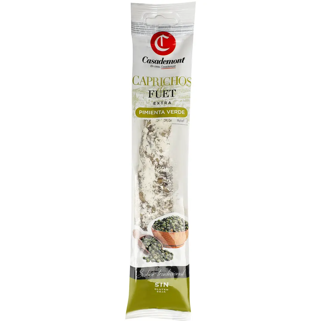 Casademont Caprichos Pimienta Verde - це вид іспанської ковбаси преміум-класу, що містить зелений перець (пім'єнта верде) як одну з основних інгредієнтів. Ця ковбаса входить до серії "Caprichos", яка підкреслює високу якість та ремісниче виробництво м'ясних виробів з насиченим смаком.