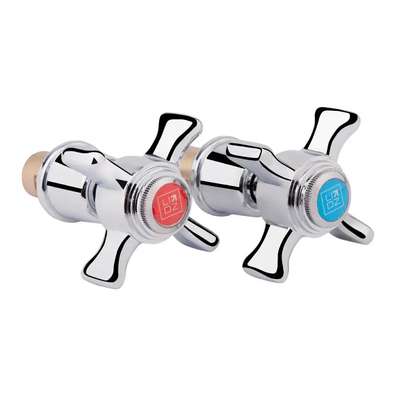 Пара кран-букс Lidz (CRM) -53 22 000 00 являє собою два хромованих вентиля з нанесеними маркуванням Х + Г води і фірмовими логотипами виробника. Вони виготовлені з високоякісної латуні, тому мають тривалий термін експлуатації і стануть відмінною заміною поламаних або неякісних. Використовуються як запірний механізм для відкриття / закриття і регулювання потоку води, яка подається з мережі. Для установки передбачений діаметр підключення 1/2 ".