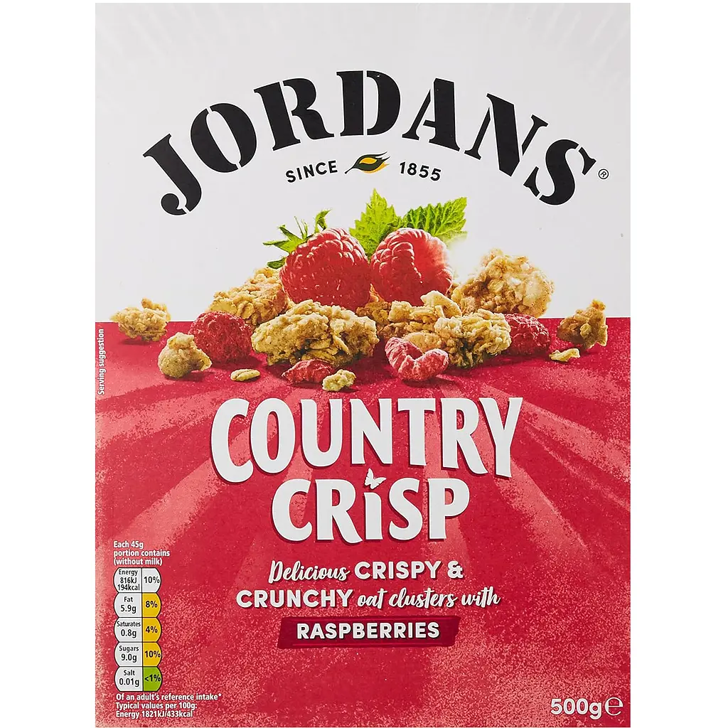 Кранчі Jordans Country Crisp - хрусткі запечені пластівці, приготовані з найкращих цільнозернових вівсяних пластівців з щедрою жменькою малини. Кранчі ідеально поєднуються з різноманітним молоком, у тому числі рослинним, а також йогуртами.