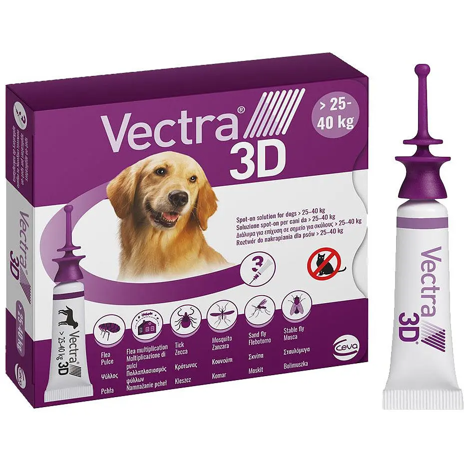 Вектра 3D застосовують собакам для боротьби з ектопаразитами тварин: іксодовими кліщами, блохами, вошами, волосоїдами, комарами, москітами.