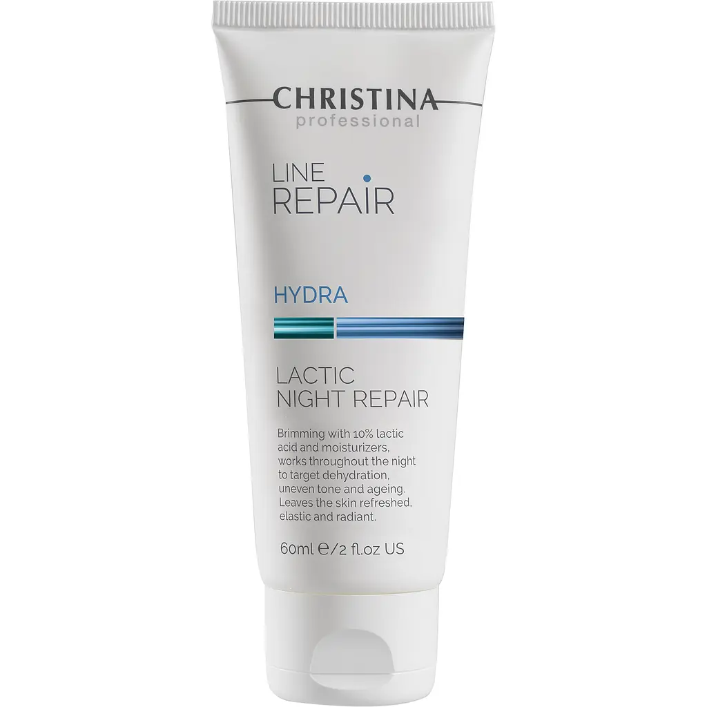 Крем для обличчя Christina Line Repair Hydra Lactic Night Repair відновлює текстуру та тон шкіри, підвищує пружність та гладкість, робить колір обличчя сяючим. Крем має інтенсивну зволожуючу дію, запобігає надмірній втраті вологи клітинами шкіри, пом'якшує її, робить пружною. Дбайливо освітлює шкіру, вирівнює її тон та зменшує вираженість пігментації.