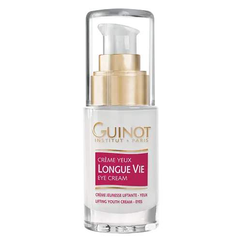 Крем навколо очей від зморшок Longue Vie Yeux Guinot 15 мл — професійний антивіковий догляд для ніжної шкіри навколо очей, який оновлює, розгладжує зморшки та усуває ознаки втоми. Завдяки унікальному комплексу активних компонентів крем повертає шкірі свіжість, пружність і молодий вигляд.