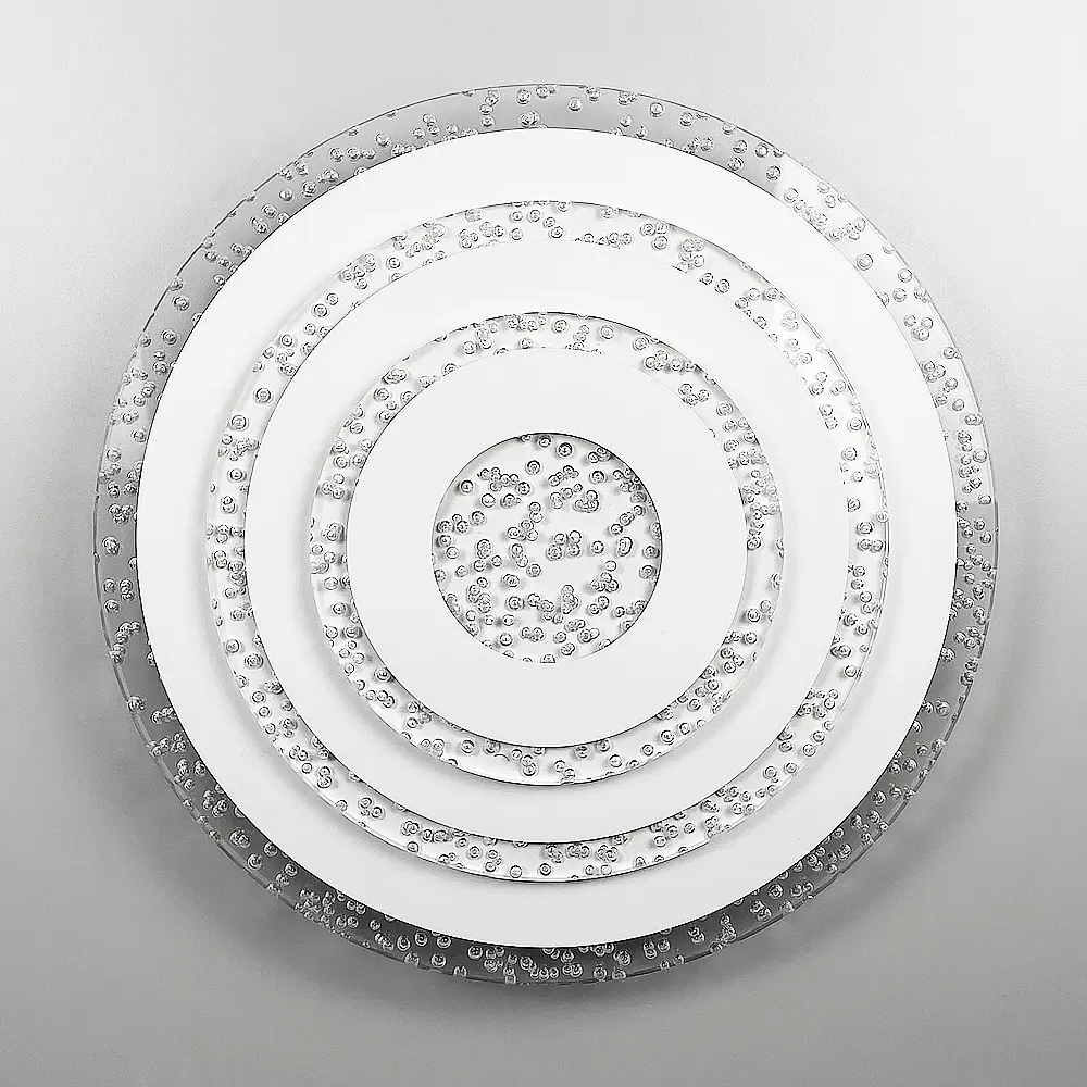 Світлодіодний стельовий або настінний світильник в білому круглому корпусі з прозорим акрилом з бульбашками. Діаметр 35 см. Потужність 53 Вт (27 Вт тепле та холодне світло). Кріплення на хрестовину 24 см. Ця модель світлодіодного світильника представлена у 2-х розмірах: 30 і 35 см Тип вимикача: 6 Форма_виробу: Коло Тип приміщення: Люстри для дитячої Серія: 2245 Колір основи: Білий Матеріал плафона: Акрил Колірна температура: 3000–4500–6000К Матеріал основи: Метал Розмір монтажної планки: 24 см Тип кріплення: Хрестовина Потужність (Вт): 53