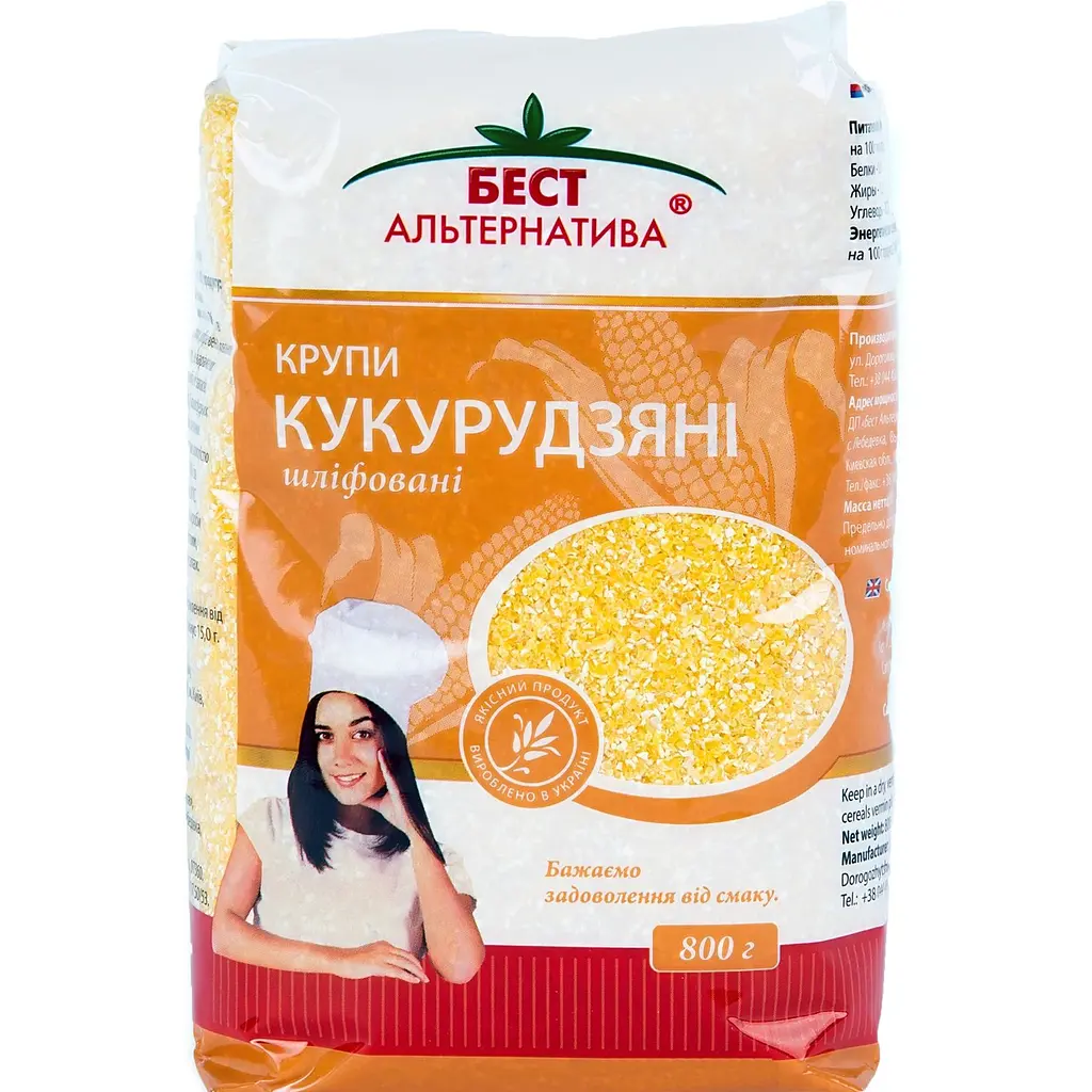 Крупа кукурудзяна Бест Альтернатива 800 г – це якісний продукт для щоденного вживання. Крупа має однорідну текстуру та приємний жовтий колір, що свідчить про гарне очищення та обробку зерна. Вона швидко готується, добре розварюється і підходить як для класичної каші, так і для поленти чи добавок до супів.