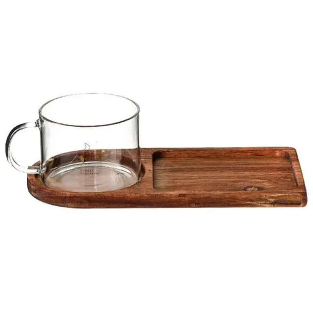 Чашка з підставкою виконана зі скла та дерева. Має зручну конструкцію та гарний дизайн. Відмінно підійде як для щоденного застосування, так і для святкового сервірування столу