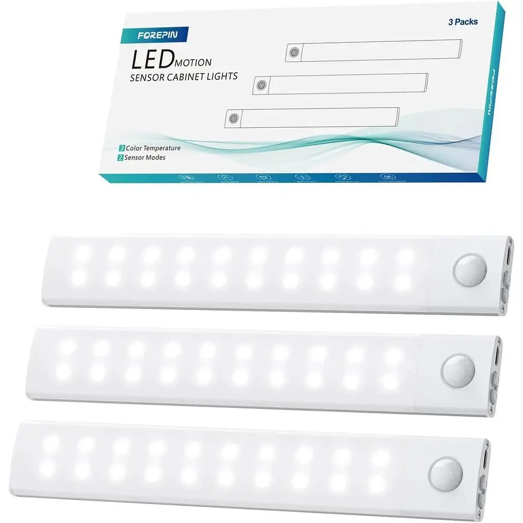Кухонні світильники Forepin Under Cabinet, 3шт. 40 світлодіодних світильників з датчиком руху з магнітною смугою, 20 см USB 3 колірні температури, що перезаряджаються, затемнювані нічні світильники для шафи сходи шафа