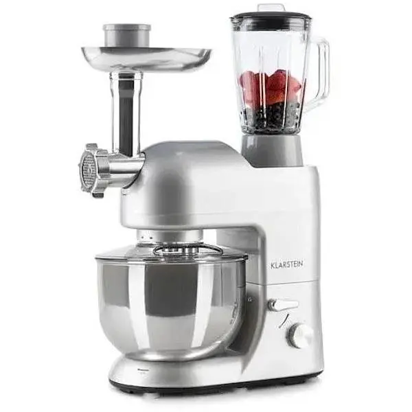 Один для всього. Кухонний комбайн Klarstein Lucia це стильне універсальне диво для вашої кухні. Надзвичайно практичний, він поєднує в собі міксер, міксер і м'ясорубку в одному пристрої. Завдяки потужності 2000 Вт на 6 рівнях, планетарній системі змішування та чаші з нержавіючої сталі об’ємом 5,2 літра він відповідає всім вимогам сучасного змішування. Ви можете приготувати свіжі смузі та смачні коктейлі в блендері об’ємом 1,5 л. А для любителів свіжого фаршу або макаронів ідеальним доповненням стане насадка для м’ясорубки з нержавіючої сталі. Барвистий дизайн вашої нової Lucia також є потужним. Це означає, що він буде зіркою на вашій кухні навіть після використання!
