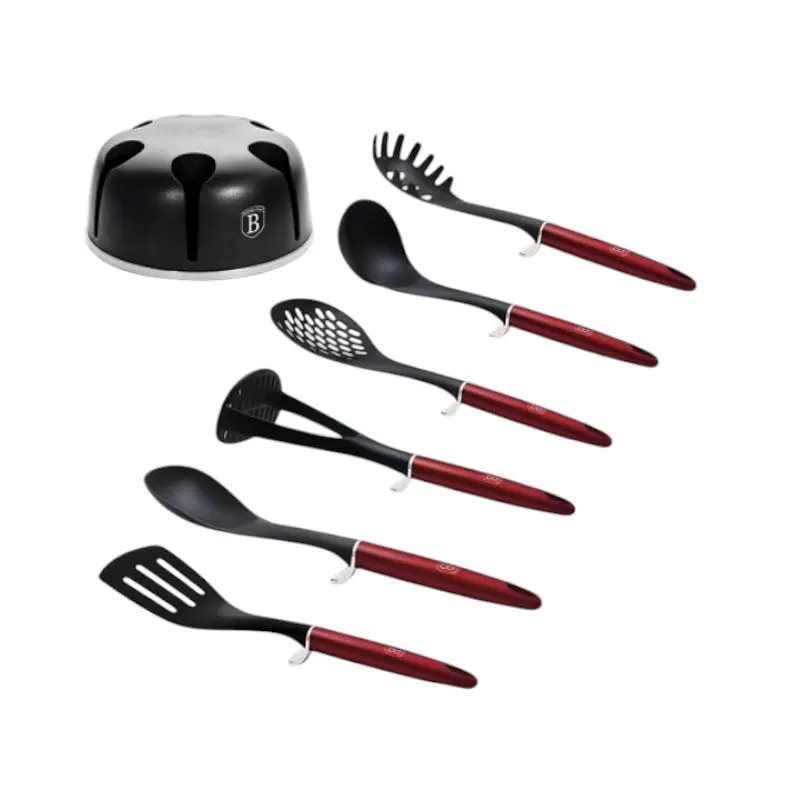 Модель вирізняється ергономічним дизайном і термостійким матеріалом, що дозволяє використовувати інструменти з будь-яким посудом без подряпин. Завдяки обертаючій підставці набір легко зберігати, а бордове забарвлення додає естетики кухні. Цей продукт стане незамінним помічником для тих, хто любить готувати, забезпечуючи комфорт і довговічність.