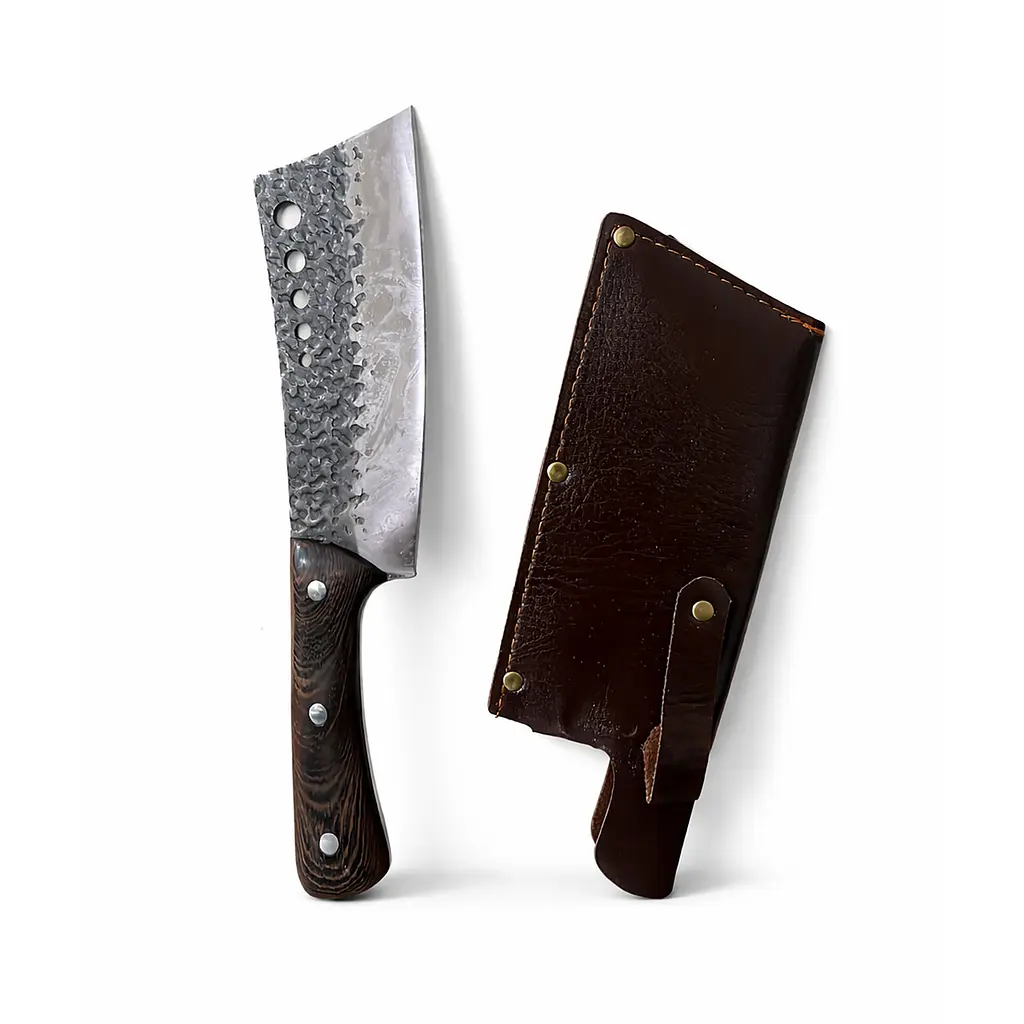 Кухонний тесак із кованим лезом і шкіряним чохлом — це практичний і виразний інструмент для кухні, який поєднує в собі функціональність, надійність і ефектний зовнішній вигляд. Модель підійде для щоденного використання вдома, а також стане вдалим вибором для тих, хто цінує якісні ножі з характерним дизайном.