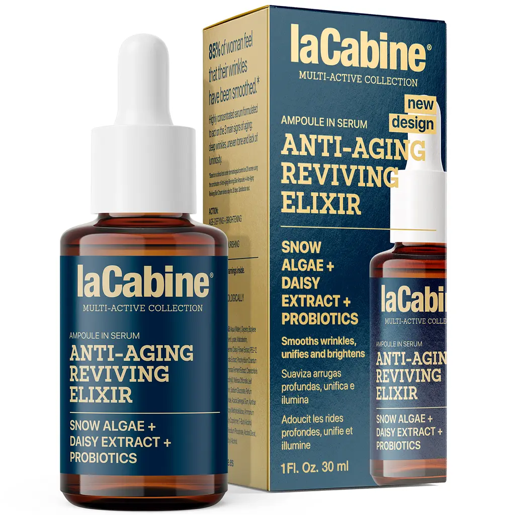 Висококонцентрована антивікова сироватка для обличчя LaCabine Anti-aging Reviving Elixir ефективно впливає на основні ознаки старіння: глибокі зморшки, втрату пружності та щільності, нерівний тон та відсутність яскравості шкіри. Засіб розгладжує глибокі зморшки, вирівнює тон шкіри, живить та освітлює її. Містить унікальну формулу з пудрою сніжної водорості, ромашкою, пробіотиками, які ефективно борються з основними ознаками старіння зрілої шкіри: темними плямами, втратою блиску та глибокими зморшками.