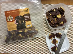 Чудові смаколики для маленьких собачок! Шматочки 4-6см, скибочка банану щільно обгорнута мʼясом, в міру сухі, запах приємний, не кришаться. У моєї мікро-шпіцуні тепер це найулюбленіші смаколики! Будемо замовляти ще!)