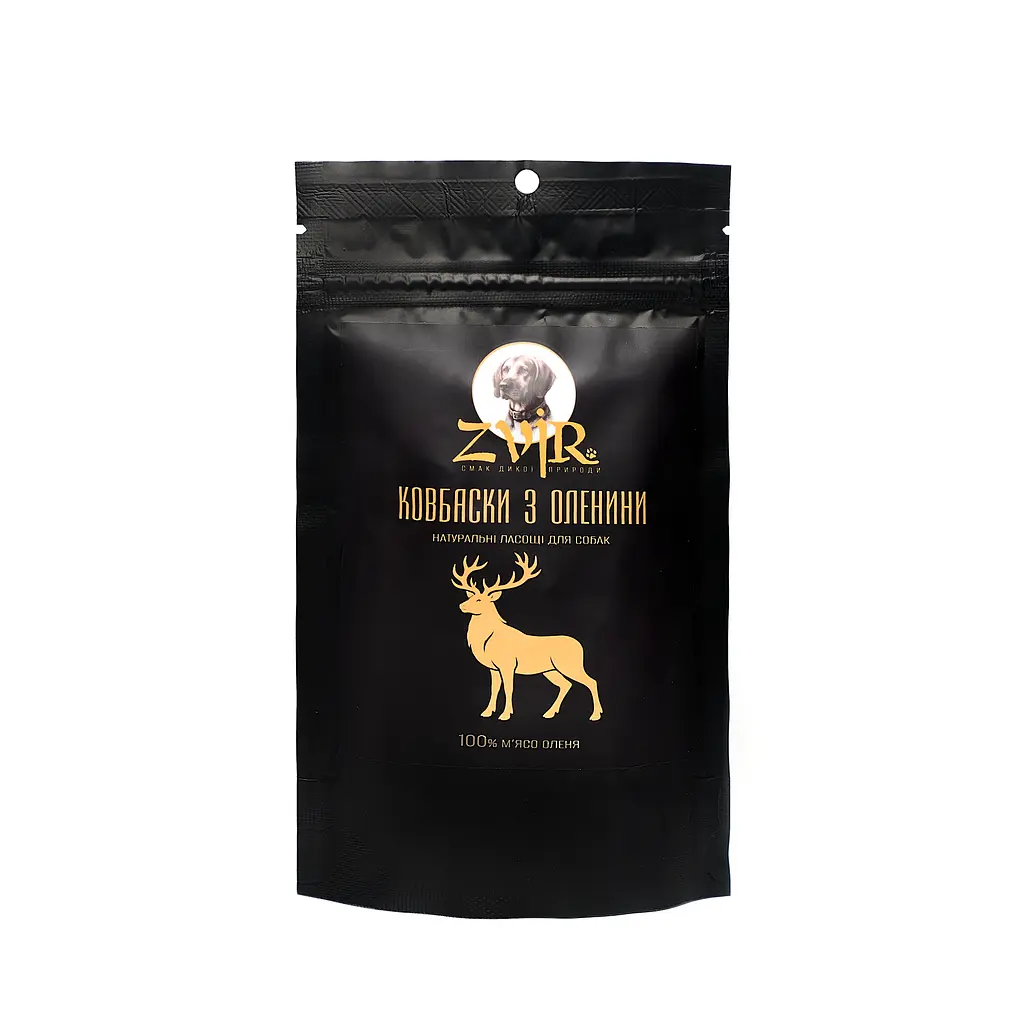 Ковбаски з оленини ZVIR — натуральні ласощі для собак на основі м'яса оленини. Продукт відноситься до категорії монопротеїнових снеків: у складі використовується лише одне джерело тваринного білка без будь-яких м'ясних сумішей або прихованих інгредієнтів.
