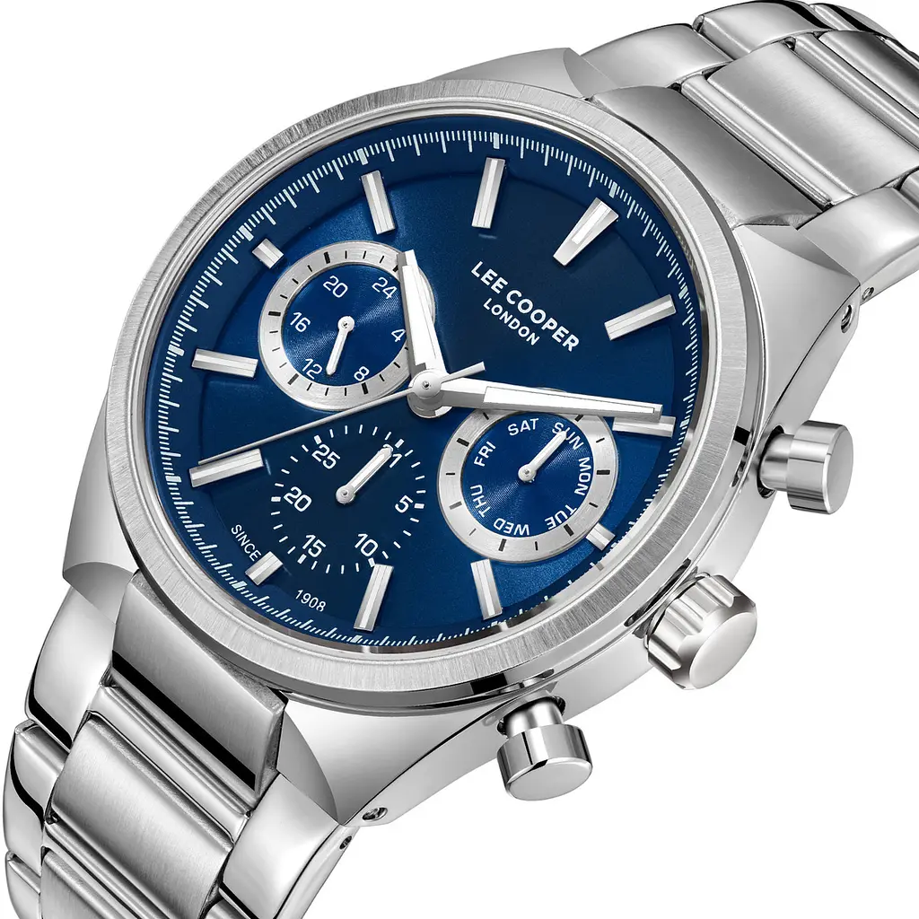Тип механізму: Quartz, Водостійкість: 5 атм - плавання, Функції: Показують дату, день тижня, подвійний час, 24-годинний формат часу, Стиль: Класичний, Скло: Мінеральне, Матеріал: Метал, Тип: Чоловічі, Застібка: Дворівнева, Товщина: 11 мм, Форма Додаткові характеристики: Індикація дати, дня тижня, Особливості: Інструкція на російській мові, Вага, г: 73, Розміри, мм: 42х11, Колір корпусу: Сріблястий, Формат часу: 12 г, Індикація: Хвилини, секунди, години, Діаметр: 42 мм, Тип циферблату Браслет, Задня кришка: Закрита, Характеристики механізму: Miyota (Японія), Гарантія: 12 місяців, Механізм: Кварцовий, Виробник: Lee Cooper, Колір ремінця: Сріблястий, Можливість зняти ремінець: Так, Довжина ремінця, см: 25 см (регулюється), Тип 2 чоловіків, Матеріал корпусу: Сталь, Фабрика збирання: Китай/Японія, Основний колір циферблату: Синій, Індекси, Особливості циферблата: Центральна секундна стрілка, За країною механізму: З японським механізмом