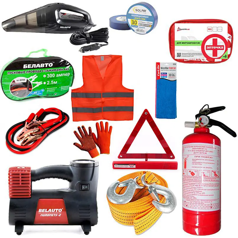 Компресор автомобільний Белавто МУРОМЕЦ 10 Атм 40 л/хв 170 Вт BK43 Пилосос автомобільний «Торнадо» BA-53B 110 Вт, 3.5 кПа чорний BA53B Набір ганчірок з мікрофібри CarLife 30x30см 3шт CC915 Рукавиці покриті нітрилом WG08 Буксирувальний трос Carlife 4,5т, 5м TR705 Провода-прикурювачі Alligator 300А, 2м BC631 Аптечка медична автомобільна-2, згідно ТУ, м'який футляр 02-011-M Знак аварійної зупинки (пласт. упак.) WT101 Жилет сигнальний XL BX18110 Стрічка ізоляційна ПВХ Solar, 0.13мм x 19мм, 25м, синя IT125 Вогнегасник порошковий ВП2 VP2-X