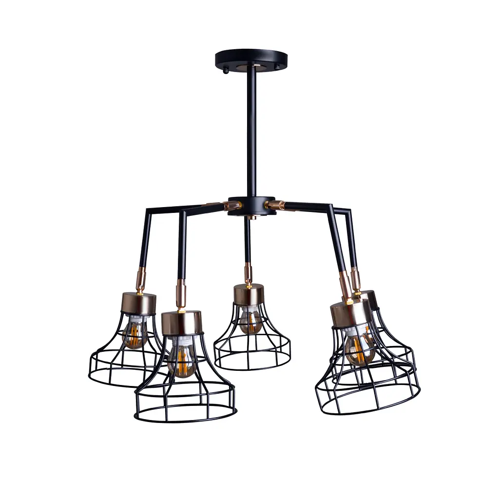 Люстра HTL-220S/5 BK+FG - сучасне та стильне рішення для інтер'єру, яке точно підкреслить особливості стилю лофт. Ця вишукана люстра оснащена п'ятьма чорними каркасними плафонами, створюючи гармонійне поєднання із золотисто-чорною гамою всього світильника. napriam_svitla вниз і в сторони дозволяє створити затишне і м'яке освітлення, що ідеально підходить для спальні, кабінету або холу. Люстра не тільки ефективно висвітлює простір, а й стає стильним акцентом, вирізняючи особливості лофт-дизайну. Цей пристрій пропонує гнучкість вибору джерел світла - світлодіодних, енергозберігаючих ламп або лампочок розжарювання, що робить його практичним та адаптивним до ваших побажань у галузі освітлення. Люстра HTL-220S/5 BK+FG - це не тільки джерело світла, а й стильний елемент декору, який додасть у ваш інтер'єр лофт-стилю вишуканість та сучасність.
