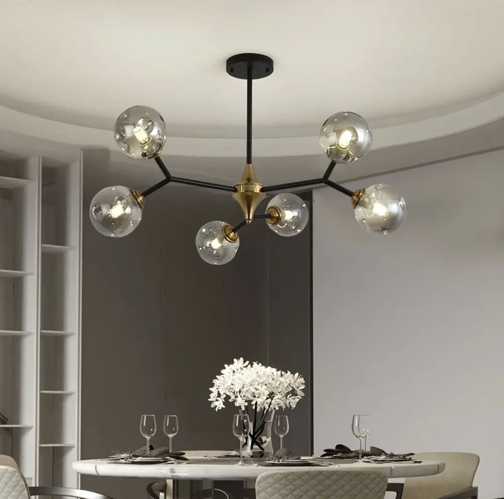 Люстра стельова в чорному металевому корпусі із латунною фурнітурою на 6 плафонів (діаметр плафона 15 см). Люстра має цоколь E27, що дозволяє легко здійснити заміну ламп. Ця модель представлена у 3-х кольорах плафона: графітовий, янтарний та прозорий. Діаметр люстри - 95 см. Висота (відступ від стелі) - 25 або 55 см. Потужність (Вт): 95 Серія: MD 8023 Колір основи: Чорний Колір плафона: Графіт Максимальна висота: 55 см Мінімальна висота: 25 см Тип цоколя: E27 Розмір плафона: 15 см Матеріал основи: Метал Розмір монтажної планки: 12 см Тип кріплення: Монтажна планка Кількість джерел світла: 6