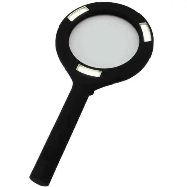 Ручна лупа з підсвічуванням PL-419 – стильний пристрій із сучасним дизайном, виконаний із пластику з матовим покриттям. Оснащена трьома панелями по п’ять світлодіодів, розташованими навколо лінзи, що забезпечують ефективне підсвічування. Лінза зі скла має діаметр 10 см і забезпечує трикратне збільшення. Живлення здійснюється від двох батарейок AA.