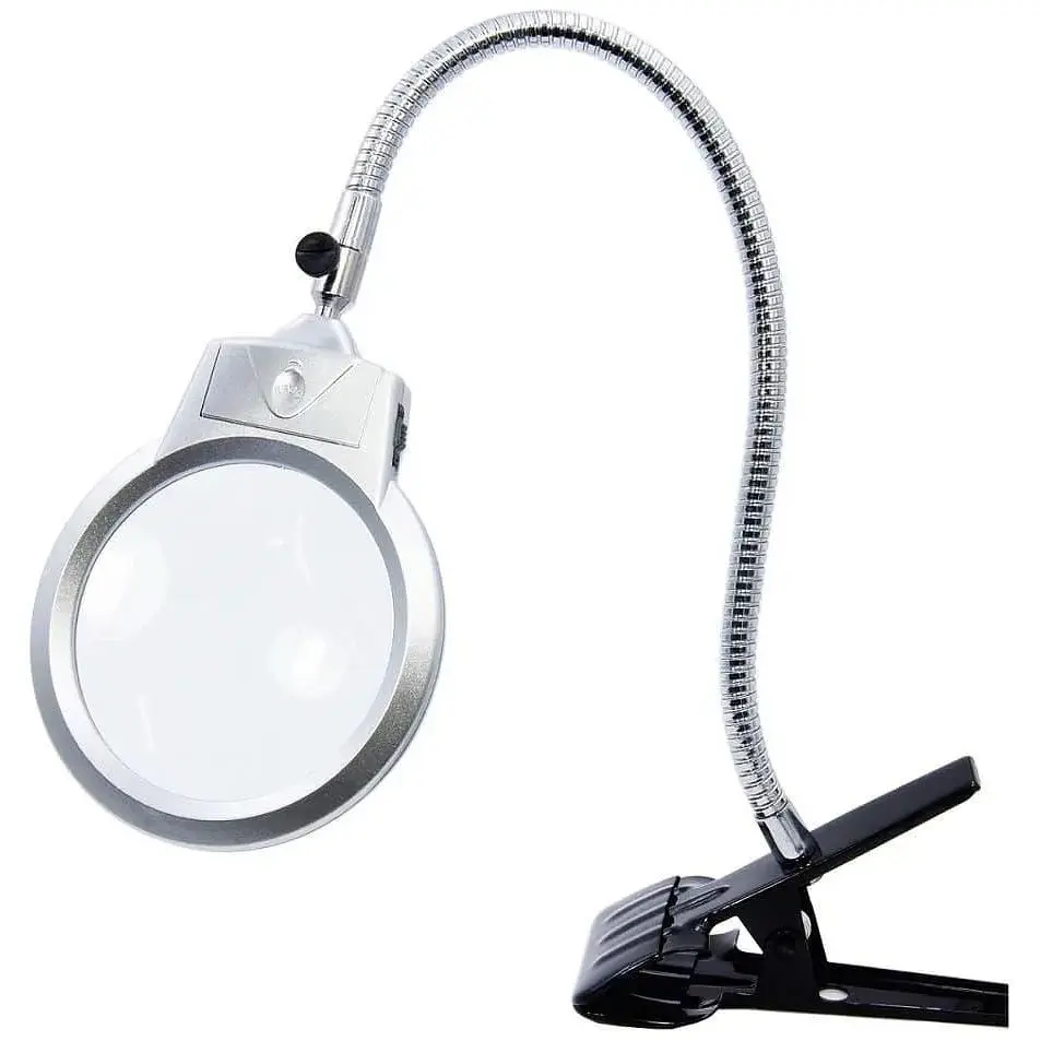 Кругла лупа на гнучкій металевій "ніжці". Ніжка вигинається в будь-який бік. На іншому кінці ніжки міцний затискач (прищіпка), за допомогою якого лупу можна прикріпити до столу або іншої поверхні.