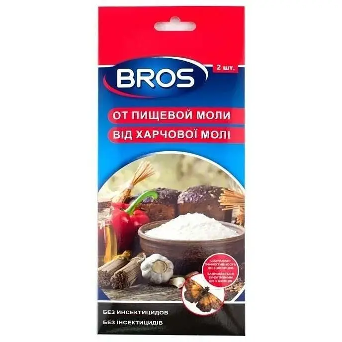 Липка стрічка від харчової молі Bros - це липка плоска пастка без запаху, використовується для виловлювання харчової молі на кухнях, коморах, складських приміщеннях та в шафах з харчовими продуктами. Завдяки феромону комахи, що входить до складу препарату, неминуче трапляються в пастку, що суттєво полегшує відстеження харчової молі та виявляти її наявність на ранній стадії.