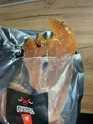 Не поділяю захоплення інших коментаторів, це найперші джерки знизу мого рейтингу, а я спробував з десяток різних виробників. Враження наче м'ясо згнило до початку сушки. М'яке, але не тому що правильно висушене. Нудотний присмак тухлятини. Трохи крихке. Якщо це буде ваше перше знайомство з подібним м'ясом, ризикуєте назавжди відмовитися від джерок/м'ясних чипсів. Не рекомендую
