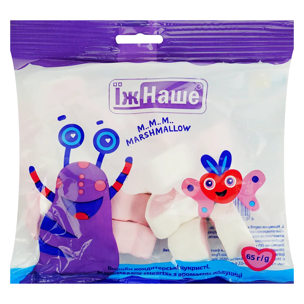 Маршмеллоу Їж Наше Hearts - ніжні, повітряні зефірки у формі чарівних сердець! Вони мають легку текстуру, приємний солодкий смак і дарують чудовий настрій кожному. Ніжні та пухкі, які тануть у роті. Форма сердець - ідеально для дітей і дорослих. Підходять для какао, десертів або просто, як солодкий перекус.