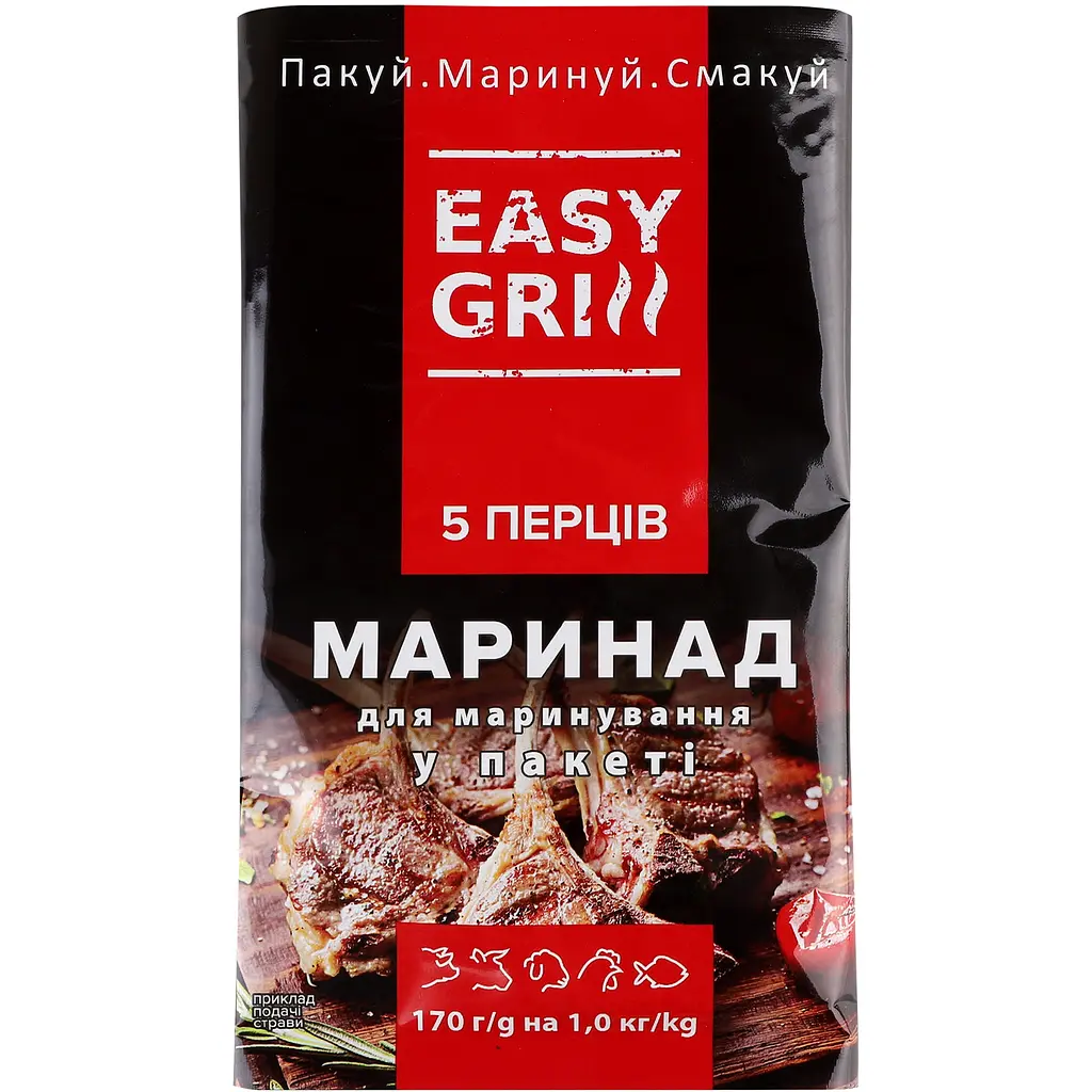 Маринад Easy grill 5 перців - ексклюзивне поєднання інгредієнтів, яке додає вашим стравам пікантного аромату та смаку. Це новий формат продукту, яке дарує більше часу для себе, рідних і друзів. І не думайте про брудний посуд: м'ясо маринується відразу в пакеті.