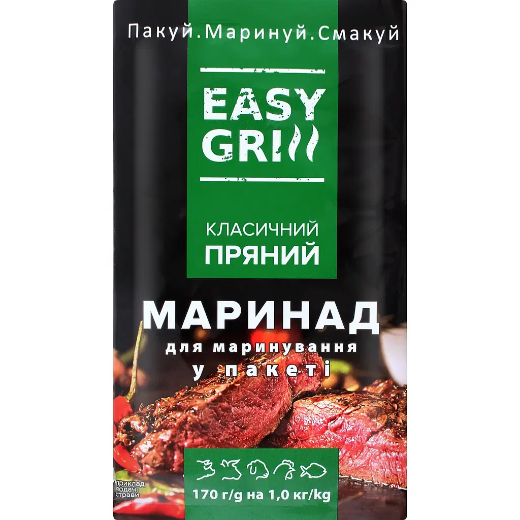 Маринад Easy grill Класичний пряний у пакеті допоможе створити справді унікальний смак страви. Він заощадить вам час на приготуванні та надасть вашому м'ясу пряний та ароматний характер, що зробить вашу гриль-вечірку чи обід на природі особливим.
