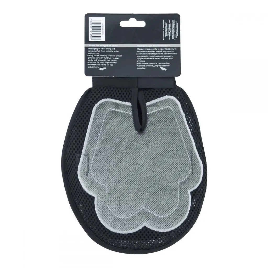 Має додаткові липучки, завдяки яким надійно фіксується на руці та не ковзає. На зворотному боці рукавиці щітка для збору шерсті.