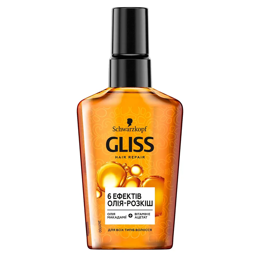 Олія-розкіш Gliss 6 ефектів призначена для відновлення волосся всіх типів та надання їм блиску.