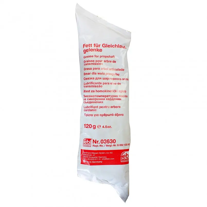 Мастило для ШРУСу триподного Febi – пластичне мастило, спеціально розроблене для обслуговування внутрішніх ШРУСів із голчастими підшипниками. Виготовлене на основі високотемпературних олій, перевершує традиційні мастила для кулькових шарнірів завдяки покращеним характеристикам. Забезпечує надійну роботу триподних ШРУСів у умовах високих температур і навантажень. Вирізняється довговічністю, стійкістю до температурного впливу та захистом від зносу, що подовжує термін служби механізмів. Підходить для використання в автомобілях марок Audi, Ford, Nissan, Renault, Seat, Subaru, Volkswagen, Volvo.