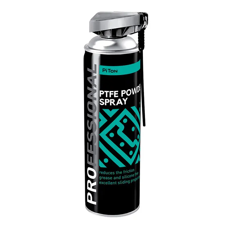 Сухе мастило PiTon PTFE Powder Spray – спеціальне сухе мастило на основі PTFE (тефлону) для обробки механізмів транспортувальних роликів, ременів, зсувних дахів у авто, сидінь, дверних петель і замків, розсувних дверей, віконних механізмів, меблевих направляючих, підшипників тощо. підходить для автомобілів, автобусів, сільськогосподарської та садової техніки, промисловості й побуту. Застосовується на поверхнях, де рідкі мастила небажані. Утворює суху плівку, яка усуває скрипи при контакті будь-яких матеріалів. Може використовуватися як розділяючий засіб для форм без силікону. Запобігає корозії, зменшує тертя, знос і заїдання механізмів із металу та пластмас. Не притягує пил і бруд, не містить силікону та жирів, без запаху.