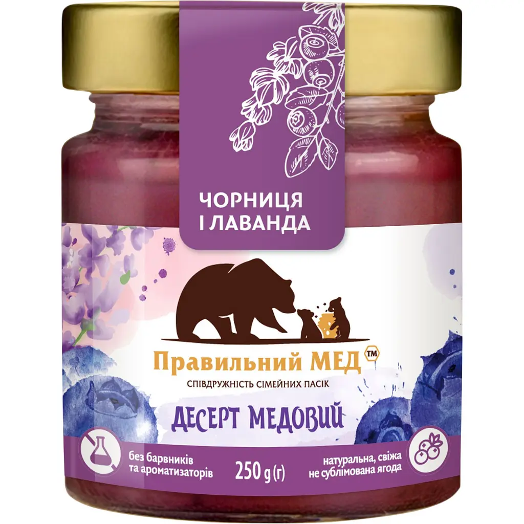 Мед з чорницею і лавандою - це елегантний делікатес, що поєднує глибокий ягідний смак чорниці з витонченим, заспокійливим ароматом лаванди. Натуральний мед слугує ідеальною основою, підкреслюючи солодкість ягід і квіткові нотки трави. Чорниця відома як джерело антиоксидантів, а лаванда додає продукту розслаблюючих властивостей. Ця суміш створює не лише гастрономічну насолоду, але й допомагає зняти напругу та покращити якість сну. Він ідеально підходить для тих, хто цінує незвичайні смакові поєднання та шукає натуральний засіб для релаксації.