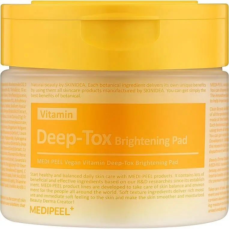 Medi-Peel Vitamin Deep-Tox Brightening Pad Висвітлюючі вітамінні педи для обличчя освітлюють, м'яко відлущують шкіру й усувають тьмяність, вирівнюючи тон і надаючи здорового сяйва. Рівень рН 5.3.
