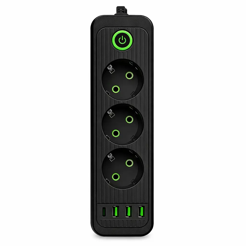 Мережевий фільтр-подовжувач чорного кольору з трьома розетками та чотирма USB-портами створений для ефективного підключення побутової електроніки та одночасного заряджання декількох мобільних пристроїв. Конфігурація 3 розетки + 4 USB (3хUSB-A та 1хUSB-C) забезпечує максимальну гнучкість у використанні сучасних гаджетів і знижує потребу в окремих зарядних блоках. Тримеровий кабель дає змогу зручно розташувати техніку на оптимальній відстані від стаціонарного джерела електроживлення.