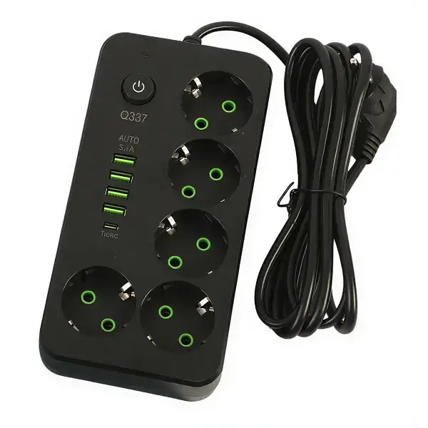 Корпус виготовлений із вогнестійкого ABS-пластику та має компактні розміри, що дозволяє розмістити подовжувач навіть у обмеженому просторі. Євророзетки розташовані з урахуванням зручності підключення різних типів вилок. На корпусі передбачено 4 USB-A порти та 1 USB Type-C для заряджання смартфонів, планшетів, навушників та інших пристроїв.