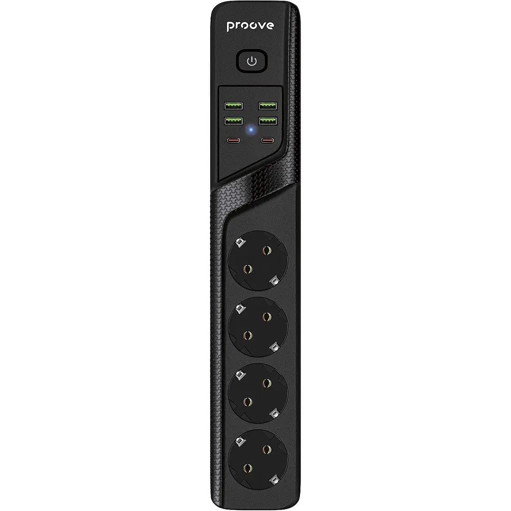 Мережевий фільтр Proove Power Socket P-04 - це універсальний пристрій, який поєднує в собі 4 стандартні розетки змінного струму, 4 USB-A та 2 порти USB-C. Така конфігурація дозволяє одночасно підключати різноманітні пристрої, від побутової техніки до мобільних гаджетів, забезпечуючи зручність та ефективність у використанні.