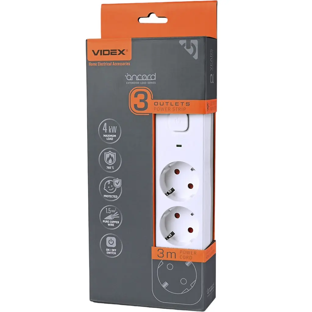 Подовжувач мережевий Videx Oncord - сучасний пристрій для дому та офісу призначений для повсякденного використання. Являє собою подовжувач з 3-ма розетками змінного струму із заземленням (тип EU).
