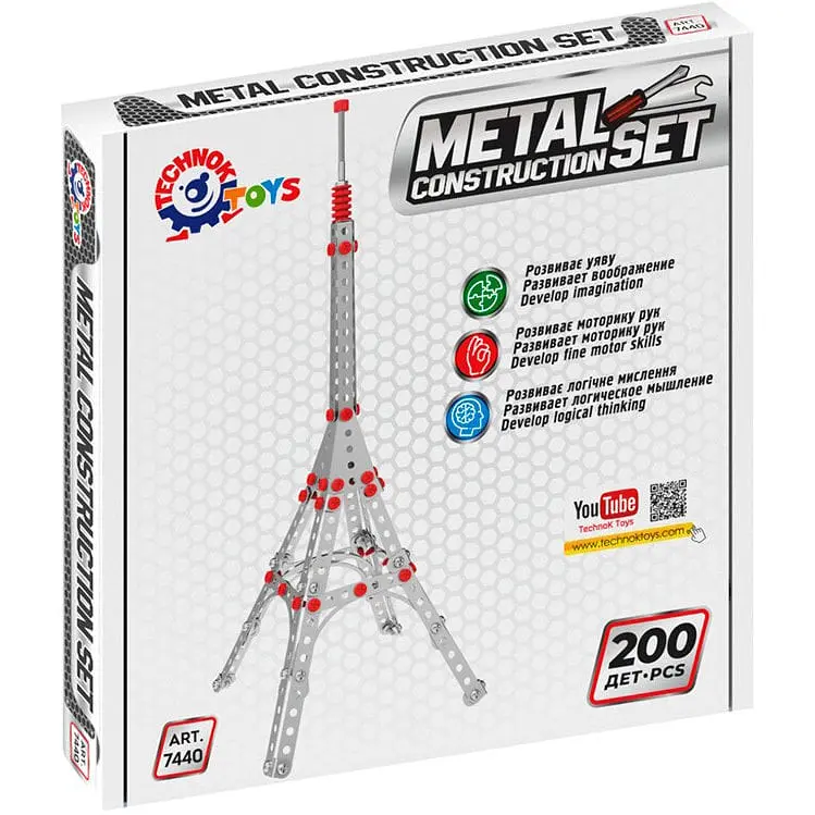 Традиція металевих конструкторів бере свій початок у далекому 18 ст. На цих конструкторах зросла безліч поколінь відомих винахідників, механіків та інженерів. Завдяки іграшці хлопчики (і дівчатка) набувають перших навичок з'єднання деталей гвинтами, гайками, роботи викруткою та ключами. Вони власноруч створюють справжні "працюючі моделі": різноманітні автомобілі, вертоліт, кран, трактор, поїзд, позашляховик, танк, мотоцикл та багато іншої техніки. Робота з конструктором: викликає у дітей інтерес до роботи машин та механізмів; дає базові поняття про взаємодію окремих елементів; знайомить з технічними назвами деталей, простими кресленнями та схемами; розвиває навички логічного мислення, просторову уяву, уважність та фантазію. Металеві конструктори використовуються під час уроків у початковій школі як набори для конструювання з різними способами з'єднання (НУШ). Нова методика STEM (Science, Technology, Engineering, Mathematics), що набирає обертів, активно застосовує такі конструктори в освітньому процесі. Наприклад, можна зібрати модель молекули, квітки, вітряка чи динозавра. Дитина не просто знайомиться з новими напрямками розвитку точних наук та інженерії, а вчиться реалізовувати вивчене на практиці. Металеві конструктори ТехноК відрізняються високою якістю та різноманітністю деталей, цікавим поєднанням металевих та пластикових запчастин. У кожному наборі є викрутки та ключі для складання моделей. Крім того, малий винахідник може вигадати власні варіанти складання і нові цікаві моделі. Творча робота є основою розвитку креативного мислення дитини. Ігри з конструктором ТехноК принесуть багато користі та будуть цікаві не лише малюкам, а й дорослим. Металевий конструктор "Ейфелева вежа" (200 деталей) - це модель всесвітньо відомої пам'ятки архітектури м. Париж, Франція. Особливістю набору є пластикові кліпси для фіксації металевих прянощів. Вони забезпечують швидкий та легкий збір конструтора. Крім функціоналу, яскравий червоний колір надає краси зібраної моделі. У наборі покрокова кольорова інструкція Упаковка - яскрава коробка. Для дітей віком від 5 років.