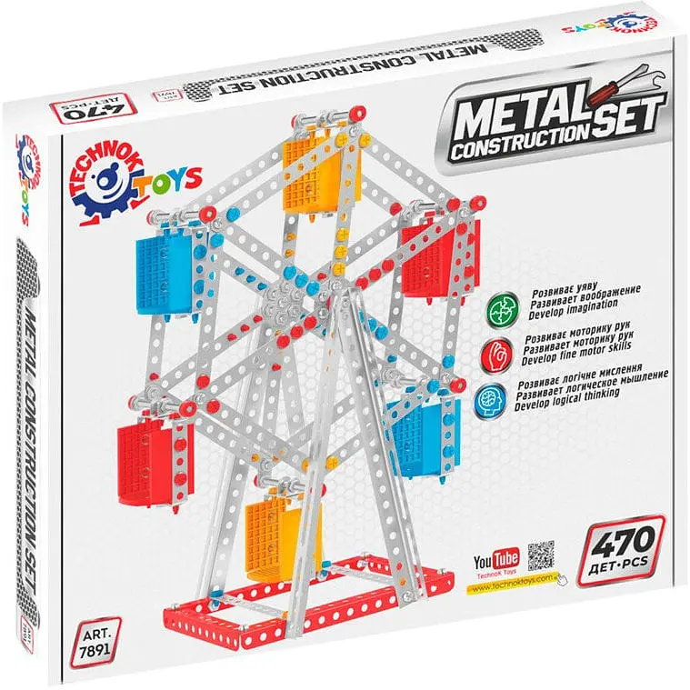 Традиція металевих конструкторів бере свій початок у далекому 18 ст. На цих конструкторах зросла безліч поколінь відомих винахідників, механіків та інженерів. Завдяки іграшці хлопчики (і дівчатка) набувають перших навичок з'єднання деталей гвинтами, гайками, роботи викруткою та ключами. Вони власноруч створюють справжні "працюючі моделі": різноманітні автомобілі, вертоліт, кран, трактор, поїзд, позашляховик, танк, мотоцикл та багато іншої техніки. Робота з конструктором: викликає у дітей інтерес до роботи машин та механізмів; дає базові поняття про взаємодію окремих елементів; знайомить з технічними назвами деталей, простими кресленнями та схемами; розвиває навикилогічне мислення, просторову уяву, уважність та фантазію. Металеві конструктори ТехноК відрізняються високою якістю та різноманітністю деталей, цікавим поєднанням металевих та пластикових запчастин. У кожному наборі є викрутки та ключі для складання моделей. Конструктор металевий арт. 7891 "Колесо огляду" (470 деталей) серії "Пам'ятки - модель одного з найбільших оглядових коліс London Eye м. Лондон, Великобританія. Висота зібраної моделі - 30 см. Особливістю набору є пластикові кліпси для фіксації металевих пластин. Вони забезпечують швидкий та легкий збір конструктора. Крім функціоналу, яскравий колір надає краси зібраним моделям. У наборах покрокова кольорова інструкція. Упаковка - яскрава коробка. Для дітей віком від 5 років.