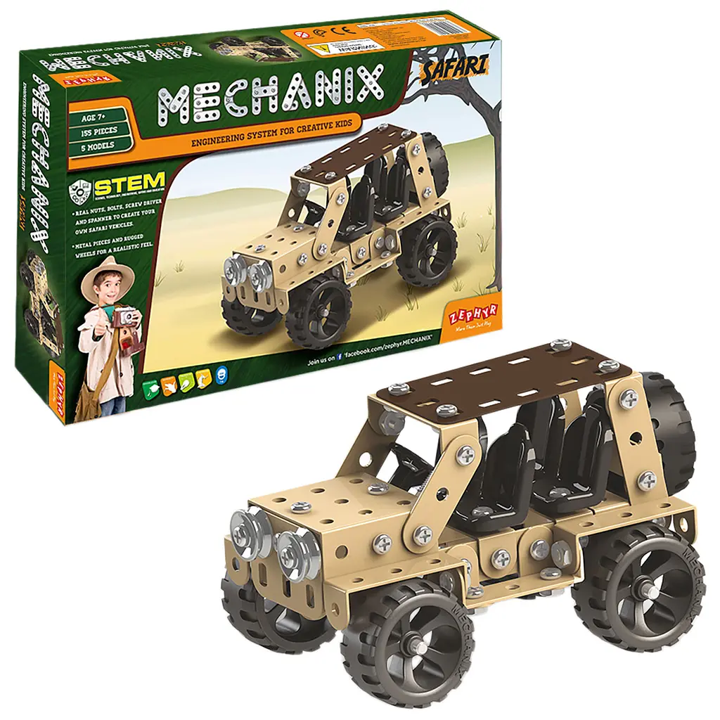 Конструктор Zephyr Mechanic Safari - це металевий розвивальний конструктор, з яким дитина зможе гратися протягом тривалого часу, зібравши при цьому почергово 5 моделей різноманітних автомобілів для сафарі, або ж придумавши власні конструкції з запропонованих деталей.