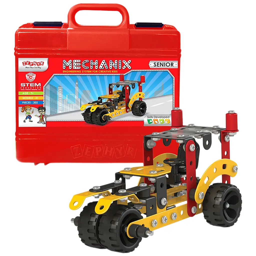 Конструктор Zephyr Mechanic Senior - це металевий розвивальний конструктор, з яким дитина зможе гратися протягом тривалого часу, зібравши при цьому почергово 21 модель різноманітних транспортних засобів, або ж придумавши власні конструкції з запропонованих деталей.