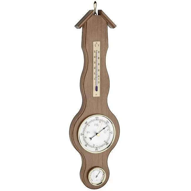 Виробник: TFA Dostmann GmbH & Co.KG, GermanyОсобливості:Вироблено в НімеччиніМетеостанція з дерева в класичному стилі SheratonЗ барометром, термометром і гігрометромВимірює тиск повітря, температуру і вологість в приміщенніТочний барометр з механізмом Domatic (точність +/- 3 ГПa) для місцевого прогнозу погодиНе потребує використання батарейокГарантія 3 рокиВи любите традиційний, не підвладний часу і ексклюзивний дизайн? Тоді ця дерев'яна метеостанція в класичному стилі Sheraton добре впишеться у ваш інтер'єр. Вона складається з барометра, термометра і гігрометра. Барометр вимірює атмосферний тиск і дозволяє робити місцевий прогноз погоди. Зі збільшенням тиску повітря погода поліпшується, а зі зменшенням тиску повітря вам слід очікувати погіршення погоди. Контролюючи температуру і вологість в приміщенні, ви можете створити комфортний і здоровий клімат в приміщенні і заощадити на опаленні. Метеостанція повністю виготовлена в Німеччині.Основним елементом TFA є власне виробництво механічних погодних інструментів. TFA створює продукцію, що відповідає етикетці «Зроблено в Німеччині», з використанням найсучасніших технологій виробництва і традиційного ремісничого виробництва. Продукція від TFA переконує в функціональності і дизайні.