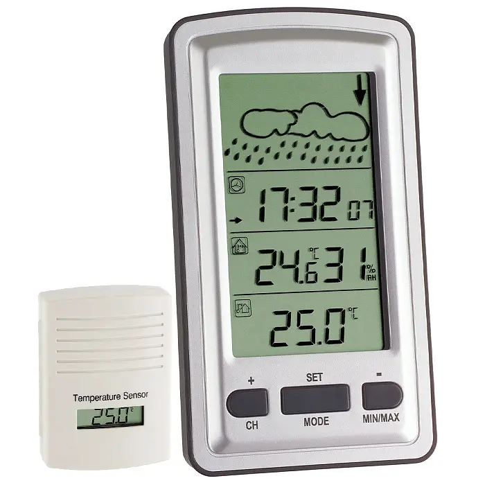 Виробник: TFA Dostmann GmbH & Co.KG, GermanyОсобливості:Бездротова передача зовнішньої температури через макс. 3 передавача (макс. 100 м)Індикація температури і вологості в приміщенніМаксимальні і мінімальні значенняПрогноз погоди з символами і тенденцією атмосферного тискуРадіокерований годинник з будильником і датоюПідсвічуванняДля настінного або настільного монтажуДуже проста установка, ніяких кабелів не потрібноЯка місцева погода сьогодні? Завдяки інформації на дисплеї бездротової метеостанції AXIS ви завжди будете у курсі.Температура зовнішнього повітря визначається безпосередньо бездротовим передавачем на місці. Сонце, хмари або краплі дощу - вбудований електронний барометр вимірює тиск повітря; Залежно від змін символ погоди дає прогноз на майбутню погоду. Для управління мікрокліматом в приміщенні відображаються температура і вологість. Завдяки цілеспрямованому опаленню та вентиляції ви створите приємне та здорове середовище проживання і навіть заощадите на опаленні. Поточний час і дата приймаються по радіосигналу DCF-77. Будильник завжди допоможе вам встати з ліжка в потрібний час. А завдяки підсвічуванню чіткий дисплей добре читається в темряві. Ще два датчика для контролю температури, наприклад в дитячій, спальні, погребі чи гаражі, можна підключити (купуються окремо).