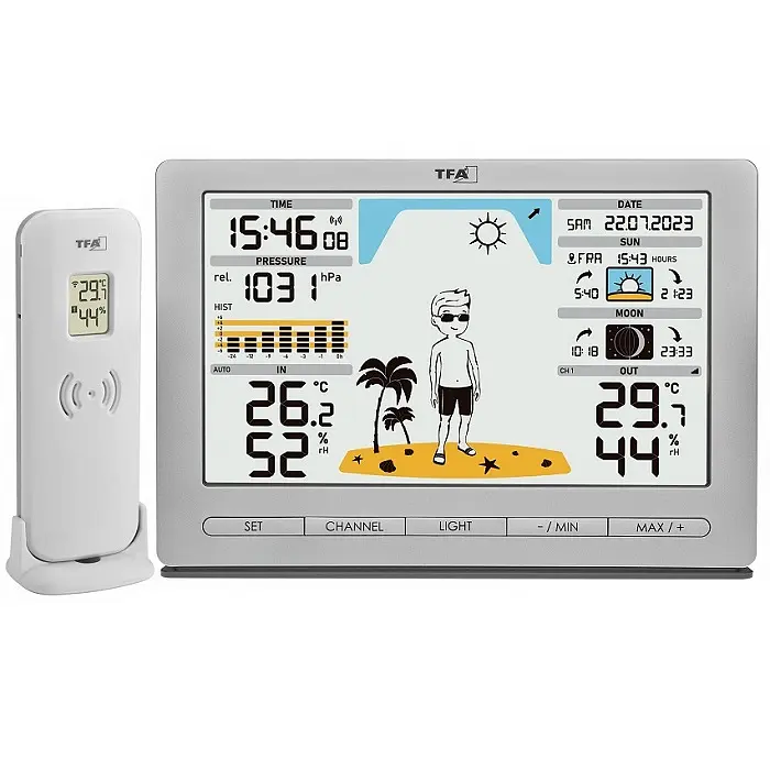 Особливості: Безпровідна передача даних про температуру та вологість зовнішнього повітря через датчик (433 МГц) з дальністю дії до 100 м (відкрите поле) Температура та вологість у приміщенні Прогноз погоди за символами погоди та «Meteo Jack» Відносний атмосферний тиск із гістограмою за останні 24 години, тенденція атмосферного тиску Максимальні та мінімальні значення температури, вологості та атмосферного тиску із зазначенням часу та дати запису Час сходу та заходу сонця з тривалістю дня Час сходу та заходу місяця із зазначенням фази місяця Вибір місця для 150 міст Європи Радіокерований годинник з повною датою та днем тижня (6 мов) Можливість ручного налаштування та корекція часового поясу Підсвічування з 4 рівнями яскравості та функцією автоматичного затемнення (при підключенні до мережі) Кріплення на стіну або настільна підставка Доступно як опція: можливість розширення до 3-х датчиків температури та вологості (продаються окремо), а також для клімат-контролю у віддалених приміщеннях, напр. дитяча кімната, винний льох і т.д. Адаптер живлення у комплекті Зареєстрований дизайн TFA Опис Чи світить сонце, йде дощ чи сніг, ранковий погляд на METEO JACK підкаже, яку погоду очікувати сьогодні і що надіти. Ця безпровідна метеостанція у зареєстрованому дизайні TFA повідомляє вам температуру та вологість у приміщенні та на вулиці та показує коливання тиску повітря за останні 24 години. У центрі однойменний METEO JACK, який змінює своє вбрання залежно від погоди. Він може вибирати між 28 різними варіантами. METEO JACK має ще більшу кількість функцій: він повідомляє вам дату, час і день тижня шістьма різними мовами, знає, коли чергуються сонце і місяць і в якій фазі місяця ми знаходимося в даний момент. Якщо вам потрібна докладна інформація про погоду, ця безпровідна метеостанція стане правильним вибором. Її висококонтрастний РК-дисплей з кольоровими елементами набагато більший, ніж у інших безпровідних метеостанцій, а дані чітко структуровані. Його дисплей може бути постійно підсвічений. В комплект входить безпровідний зовнішній датчик, але ви можете додати ще до трьох датчиків, щоб також перевіряти клімат у вашому саду, підвалі та дитячій кімнаті. Метеостанцію METEO JACK можна зручно встановити чи закріпити на стіні. Якісний продукт від TFA Dostmann GmbH & Co.KG, Germany