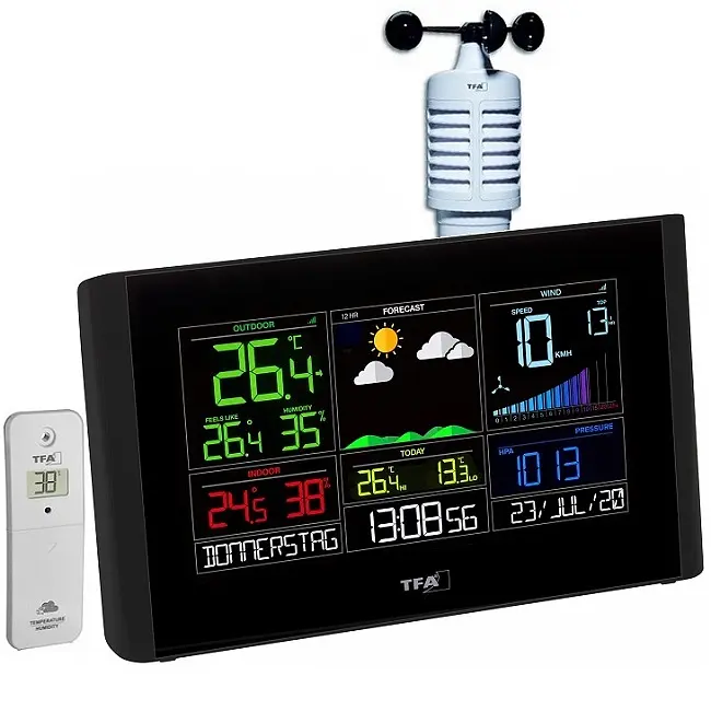 Виробник: TFA Dostmann GmbH & Co.KG, GermanyОсобливості:Кольоровий дисплей з 3 рівнями яскравості і регульованою функцією затемнення (при безперервній роботі тільки з адаптером живлення)Бездротова передача даних про температуру, вологість і швидкість вітру на вулиці через передавачі (868 МГц, макс.100 м)Відображення температури і вологості в приміщенніПрогноз погоди з кольоровим зображенням погоди та атмосферного тискуМакс. / Мін. функція, охолодження вітром і крапка росиСигналізація температури, вітру і вологостіЧас і дата з зазначенням дня тижня, написаного повними буквамиДодаткові передавачі можуть відображатися на станції (доступно як опція)Додаткові функції на станції через напрямок вітру, професійний прогноз погоди для регіону на кілька днів і частин дня з очікуваними максимальними і мінімальними значеннями і ймовірністю дощу від онлайн-метеослужби, автоматичні налаштування часу і персоналізовані повідомленняДодаткові функції через безкоштовний додаток отримання значень вимірів зі станції по всьому світу (включаючи історію за останні 30 днів), регульовані межі спрацьовування сигналізації і push-повідомлення в разі спрацювання сигналізації, можна додати додаткові передавачі (опціонально)Зареєстрований дизайн TFAБездротова метеостанція VIEW BREEZE з Wi-Fi доповнює ваші власні дані місцевих спостережень професійними прогнозами онлайн-метеорологічної служби. Станція має два зовнішніх передавача: Термогігро-передавач контролює зовнішню температуру і вологість, а анемометр визначає силу вітру на місці установки. Дані відправляються на базову станцію на відстані до 100 м (відкритий простір). Вбудований електронний барометр вимірює тиск повітря, а кольорове зображення погоди дає прогноз на майбутню погоду. Ви також отримуєте огляд температури і вологості в приміщенні і можете управляти кліматом в приміщенні за допомогою цільового обігріву та вентиляції. Крім того, VIEW BREEZE пропонує додаткову інформацію, таку як максимальні і мінімальні значення, температура «холоду вітром», крапка роси і налаштування сигналізації для декількох параметрів, а також годинник з повним записом дати і дня тижня. На станції може відображатися до 4 додаткових передавачів, наприклад для контролю температури і вологості в дитячій кімнаті або передавач в басейні. Яскравість висококонтрастного кольорового дисплея регулюється за трьома рівнями. Вночі він автоматично затемнюється. Ці функції доступні без підключення до Інтернету; Це означає, що VIEW BREEZE можна також використовувати як повноцінну «автономну» метеостанцію. Метеостанція інтегрована в локальну мережу WLAN за допомогою безкоштовного додатку TFA VIEW. Просто дотримуйтесь інструкцій в додатку. Коли станція підключена до Інтернету, відображення змінюється, і маленький символ вказує, яка інформація зараз імпортується через онлайн-службу погоди. Напрямок вітру з'являється на додаток до сили вітру. Замість прогнозу погоди, заснованого на зміні атмосферного тиску, тепер ви отримуєте професійний і постійно оновлюваний 12-годинний прогноз для вашого регіону. Ви також можете викликати прогноз на наступні 12 годин або 7 днів індивідуально одним натисканням кнопки. З'являються й інші цікаві відомості про погоду, такі як очікувані максимальні та мінімальні температури і ймовірність дощу. Час і календар регулярно