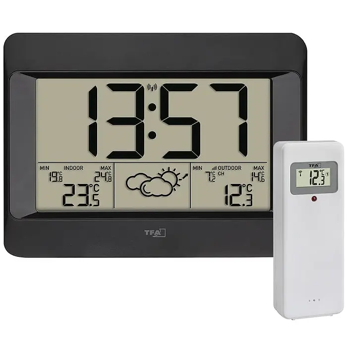 Особливості: Зовнішня температура через безпровідний зовнішній датчик (433 МГц) із дальністю дії до 100 м (відкритий простір). Температура у приміщенні. Постійна індикація значень максимальної та мінімальної температури. Прогноз погоди із символами та тенденцією атмосферного тиску. Радіокерований годинник з великим дисплеєм. Будильник із функцією повтору. Індикація дати. Можливість ручного налаштування часу та часового поясу. Для настінного монтажу або окремо встановленого (настільна підставка). Додатково: можливість розширення до 3 датчиків температури (продаються окремо) для контролю температури у віддалених приміщеннях, наприклад, дитяча кімната, винний льох тощо. Зареєстрований дизайн TFA. Опис: Просто подивившись вранці на безпровідну метеостанцію Zeno, ви завжди будете готові до нового дня. Великий цифровий екран дозволяє легко зчитувати час навіть на відстані. Радіокерований годинник завжди показує точний час і забезпечує пунктуальність навіть при пробудженні. А якщо ви не хочете одразу вставати, ви можете скористатися функцією повтору. Яку погоду ви очікуєте сьогодні? Барометр реєструє зміни атмосферного тиску та повідомляє про очікувану зміну погоди на наступні 6-12 годин за допомогою стрілки тенденції та відповідного погодного символу. Зовнішня температура визначається комплектним радіопередавачем, який встановлюється на відкритому повітрі у захищеному місці. Також вимірюється температура у приміщенні на місці встановлення метеостанції. Цілеспрямоване опалення та вентиляція дозволяють регулювати температуру в приміщенні та економити на опаленні. Можна підключити два додаткові датчики для контролю температури, наприклад, у підвалі або в гаражі. На дисплеї постійно відображаються максимальні та мінімальні значення внутрішньої та зовнішньої температури. Скидання робиться вручну. Комплектація Базова метеостанція, датчик температури 30.3248.02, інструкція з експлуатації. Розміри (ВхШхГ) 160 х 216 х 28 мм (базова станція), 105 х 40 х 26 мм (датчик). Живлення Батарейки 2 x 1.5 В AА (базова станція), 2 x 1.5 В AАА (датчик), немає у комплекті. Гарантія 12 місяців офіційної гарантії від виробника. Про TFA Сімейна компанія TFA Dostmann GmbH & Co.KG виробляє погодні та вимірювальні прилади на власному виробничому підприємстві в Райгольцхаймі (біля Вертгайма, Німеччина) з 1964 року або виробляє їх по всьому світу. Термометри, термогігрометри, барометри та метеостанції тепер доповнюються настінними годинниками, будильниками, таймерами, вагами та багатьма іншими корисними товарами для щоденного використання. Понад 1000 вимірювальних приладів, які надихають - від функціональних до орієнтованих на дизайн, від позачасових до сучасних. TFA Dostmann є однією з провідних компаній у цій галузі в Європі. Відкрийте для себе високоякісні інноваційні продукти для всього, що стосується погоди, клімату в приміщенні та часу.